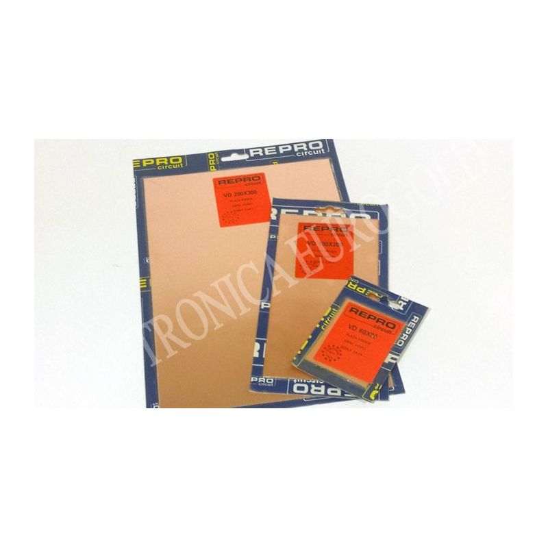 Placa virgen de fibra de vídrio de doble cara para fabricar tus propios circuitos y proyectos.Fabricación por la marca Reprocircuit ,marca puntera en calidad de este tipo de productos de electrónica.Placas fabricadas por profesionales.